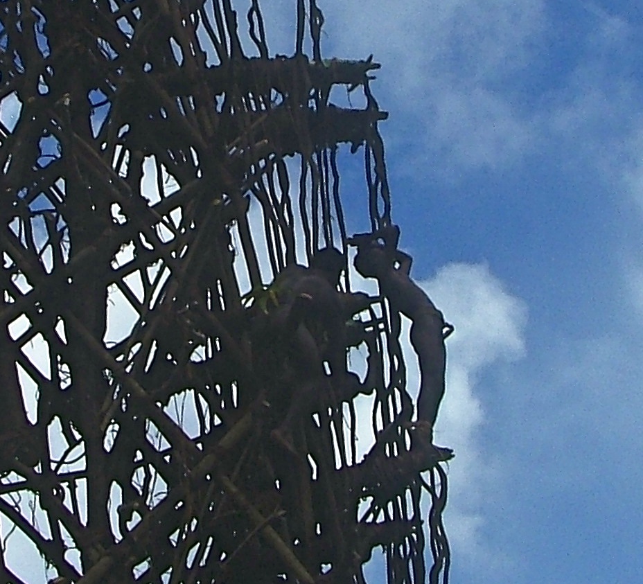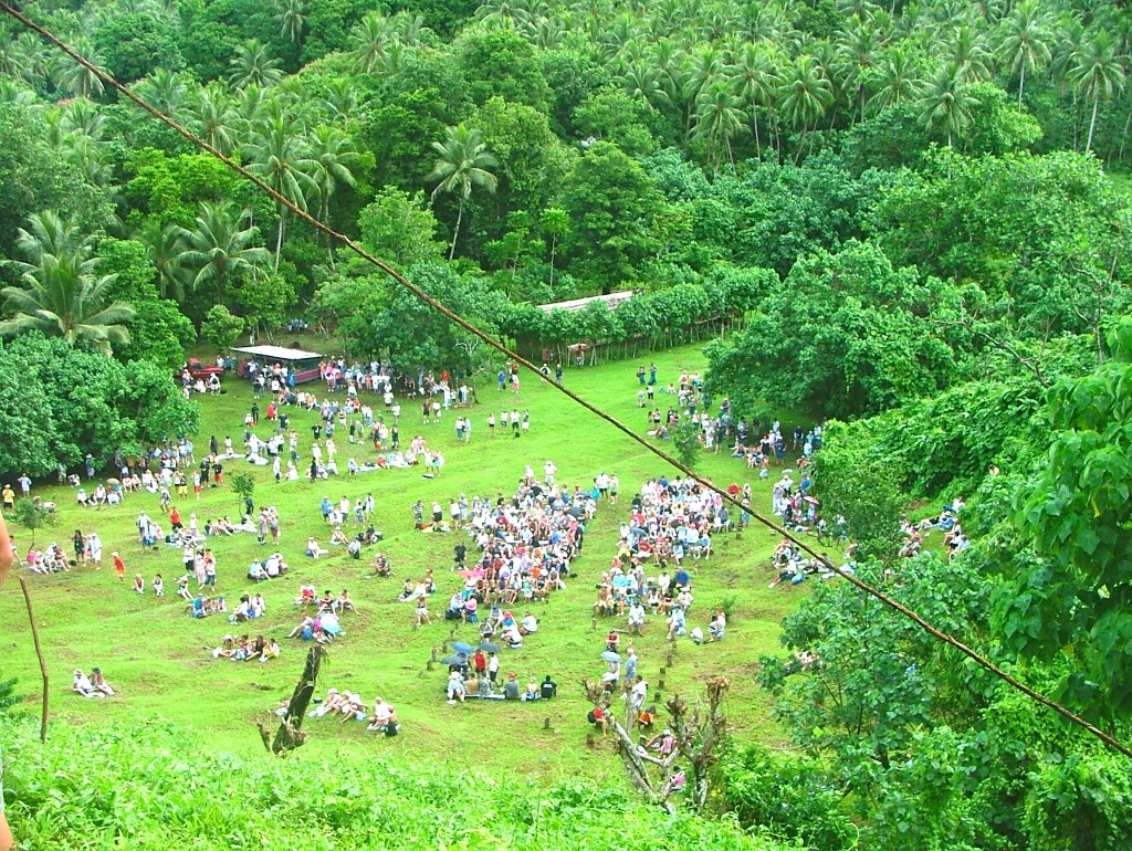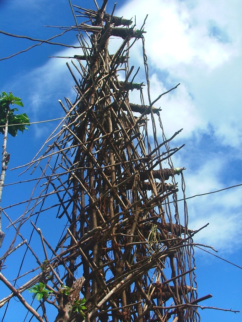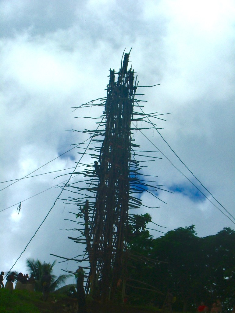 After leaving the village we followed along a little further before turning inland. Arriving at a grassy basin, both villagers and visitors were spreading rugs on the ground, arranging food baskets and generally settling in comfortably for the afternoon. Precariously perched on top of a high knoll at the far end of the basin, an enormous rickety tower dominated the scene. Around thirty metres high, it was constructed with saplings and branches, all bound together by lianas,