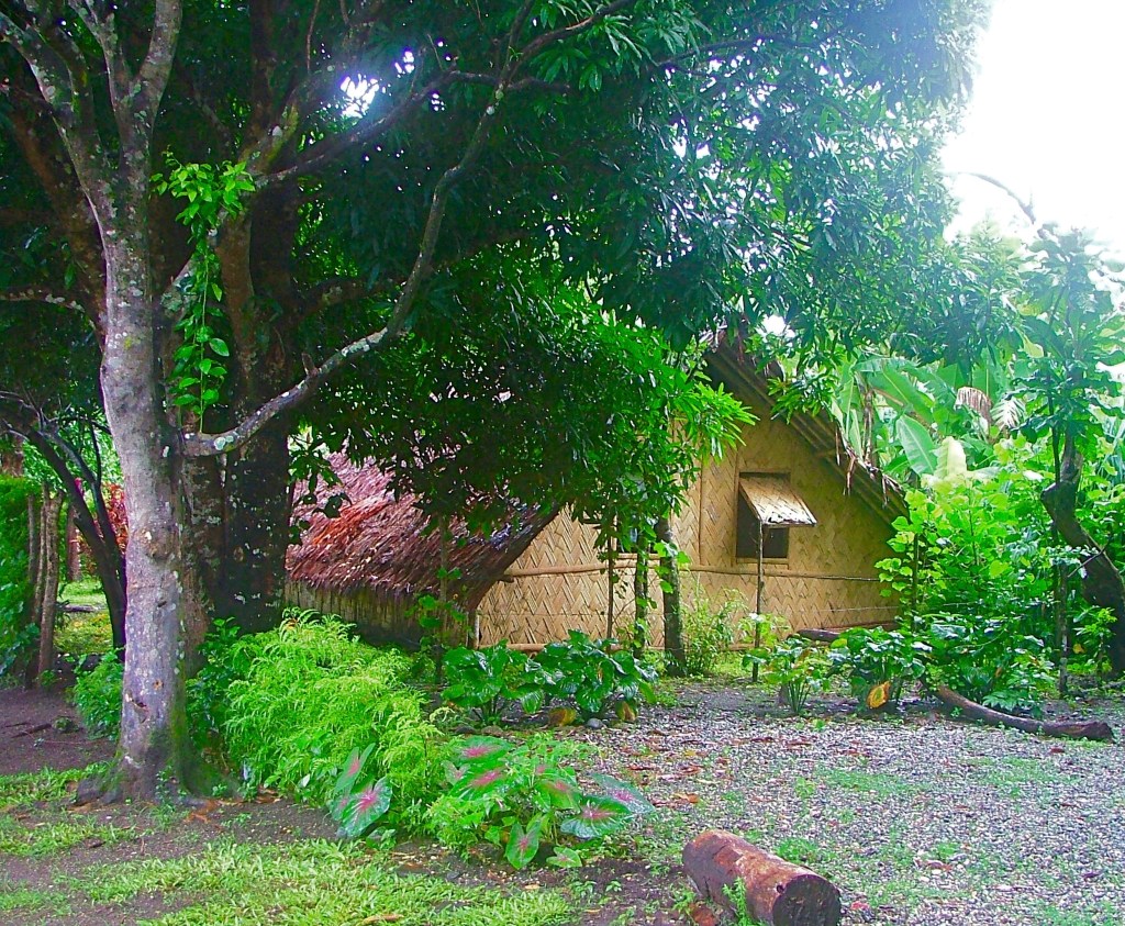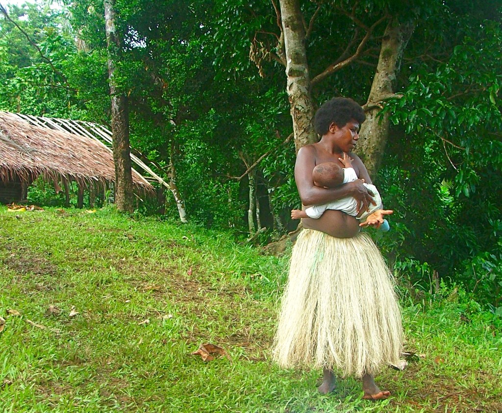 The village was busy; everyone was out watching this stream of visitors pouring along their street. A small band played and sung songs of welcome. Ladies in their brightly printed Mother Hubbard-styled dresses, congregated and chatted. Bare-footed children swarmed excitably, or peeped out shyly from behind their mothers’ skirts. Hens pecked and scratched the ground, the odd pig snuffled about, surrounded by clouds of flies, and dogs lay stretched out in the shade. Like all Pacific Islanders, the smiles were wide and welcoming. There was a festive air.