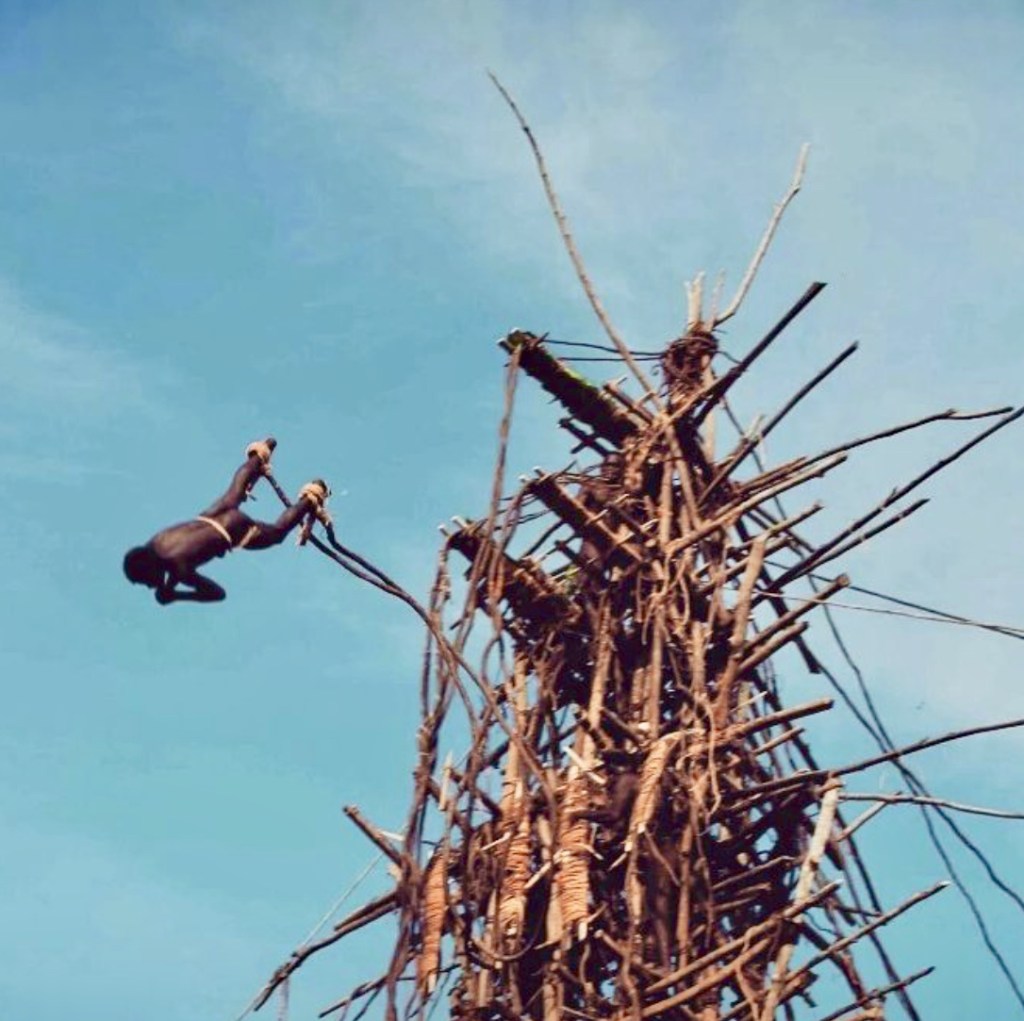 There is irony in the fact that this kastom, filled with taboos against women in every turn, from preparation to performance, actually originates from a clear-headed woman. Legend tells of this woman, running into the jungle, frantically trying to escape her abusive husband, Tamalie. Angrily, he pursued her so she frantically climbed a huge banyan tree to hide in. But he found her and followed up the tree, so at the top she quickly tied a liana around her ankle, and jumped before her husband could reach her. The vine saved her life. Seeing her fall, Tamalie thought she had committed suicide, so in grief, jumped out of the tree himself, and was killed. For the first years, it was the women who were jumping out of trees, honouring the bravery of Tamalie’s wife. In due course however, the village elders felt that the women were shaming their courage and manhood, so set up their own jumps from specially constructed towers, banning women from all further participation. It was also a cautionary tale that no man henceforth be tricked by a woman in such a way again. Over time, subsequent weaving of various kastoms has created the complex ritualistic event as practised today.