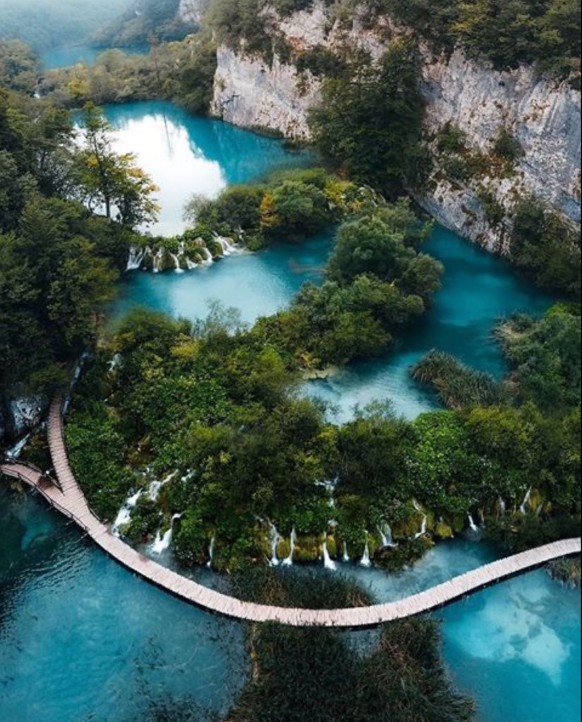 This time the path took us high along the walls of the canyons giving us majestic views down into the narrow and deeper lakes, shimmering emerald green in the afternoon sun. Really, the beauty of this whole place was such a scenic overload! Far below we could see the boardwalks starting again and sure enough, soon the path took a steep descent, and we found ourselves zigzagging down the canyon walls and back onto the lowest of the lakes.