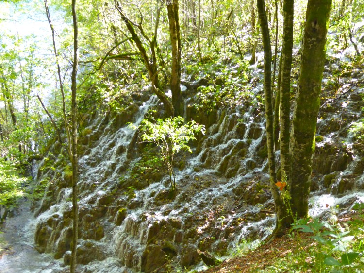 This was one of the four lower lakes, formed in limestone basins along the canyon. The lake shores were steep and densely covered with forest which was just starting to tinge towards autumn golds and oranges. Another week or so and it would have been spectacular, but you cannot hold the seasons to your holiday agenda. It was a beautiful day and the lake was serene and still, the surface sparkling in the morning sunlight. Occasionally the sun picked up the silver of waterfalls on the far bank, and approaching the opposite shore, we were able to see them more clearly, slightly hidden amongst the thick foliage hanging from the banks.